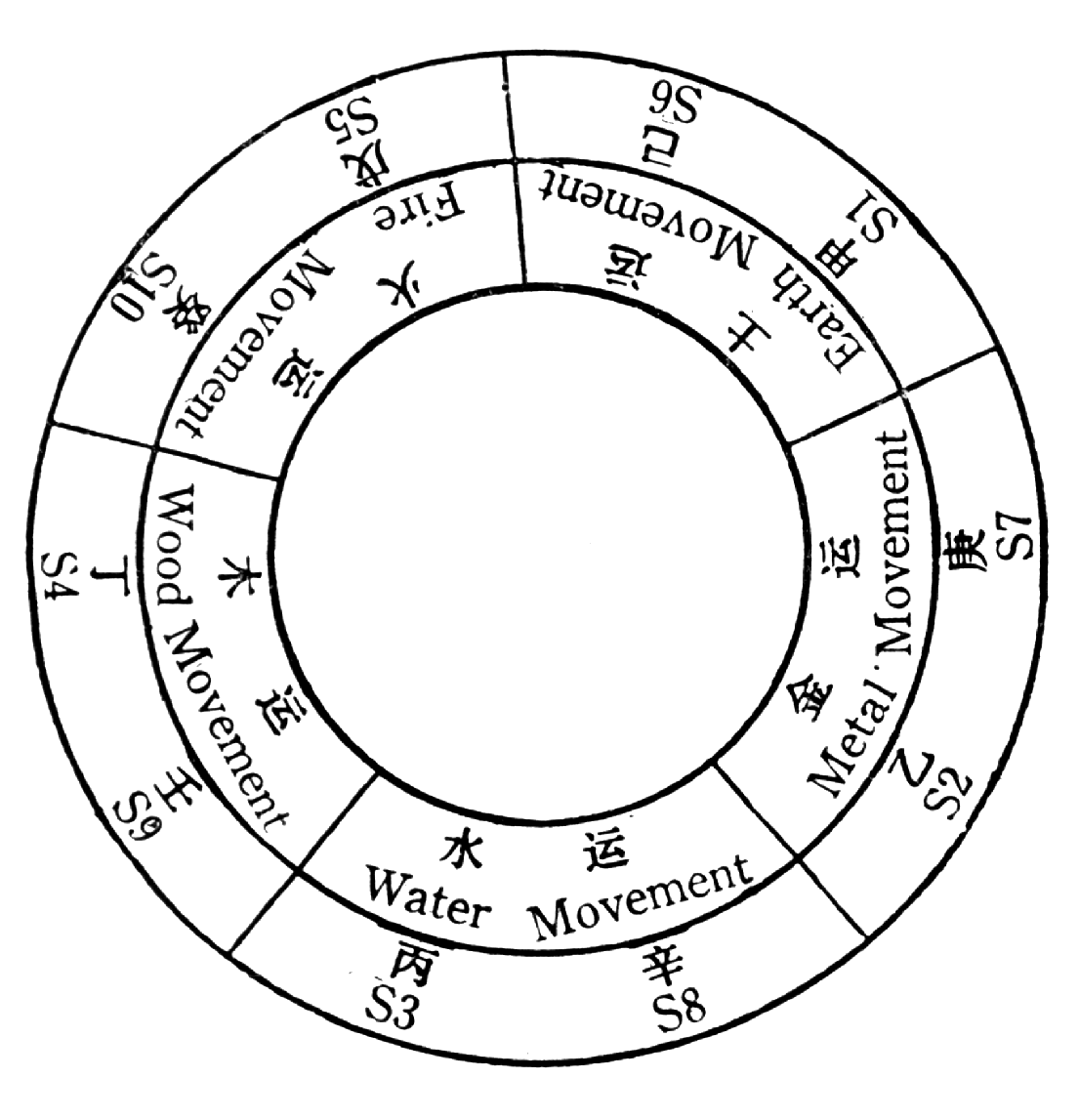 " übersetzt werden kann. Wir erleben dann ein Feuerwerk kosmologischer Spekulationen, mit dem diese zentrale Idee der chinesischen Medizin erklärt wird.Die zugeordneten Himmelsstämme als Embleme der makrokosmischen Kräfte von Yin und Yang werden in einer bestimmten Ordnung miteinander verknüpft, sodass Holz und Feuer sich entwickeln können. Dieses entspricht der Großen Bewegung Da Yun am Himmel, welche die grundlegende meteorologische Konstellation eines Jahres ausmacht.